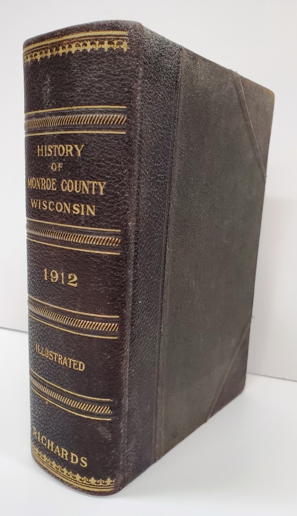 1912 “History of Monroe County, Wisconsin, Including an account of the Cities, Towns and Villages of the County” by Randolph A. Richards. This original 1912 history of Monroe County, Wisconsin, provides a comprehensive overview of the history of the county from the early years of European exploration and settlement. Topics covered include Native American tribes, the Black Hawk War, early settlement, railroads, newspapers, Monroe County residents in the Civil War and the Spanish-American War, agriculture and dairying, banks, manufacturing and business, the legal and medical professions, civic and social organizations, businesses and industries, schools, and churches. Histories of the cities, towns, and villages of Sparta, Tomah, Cashton, Kendall, Wilton, Norwalk, Adrian, Angelo, Byron, Clifton, Glendale, Grant, Greenfield, Jefferson, La Grange, Lafayette, Leon, Lincoln, Little Falls, New Lyme, Oakdale, Portland, Ridgeville, Scott, Sheldon, Wells, Wellington, and Wilton are included, as are biographical sketches of county residents. Does include an index. Hard cover; 946 pages. Copy in good condition; binding slightly loose inside covers; frontispiece page has come loose but is still included. Cover has slight edge wear.